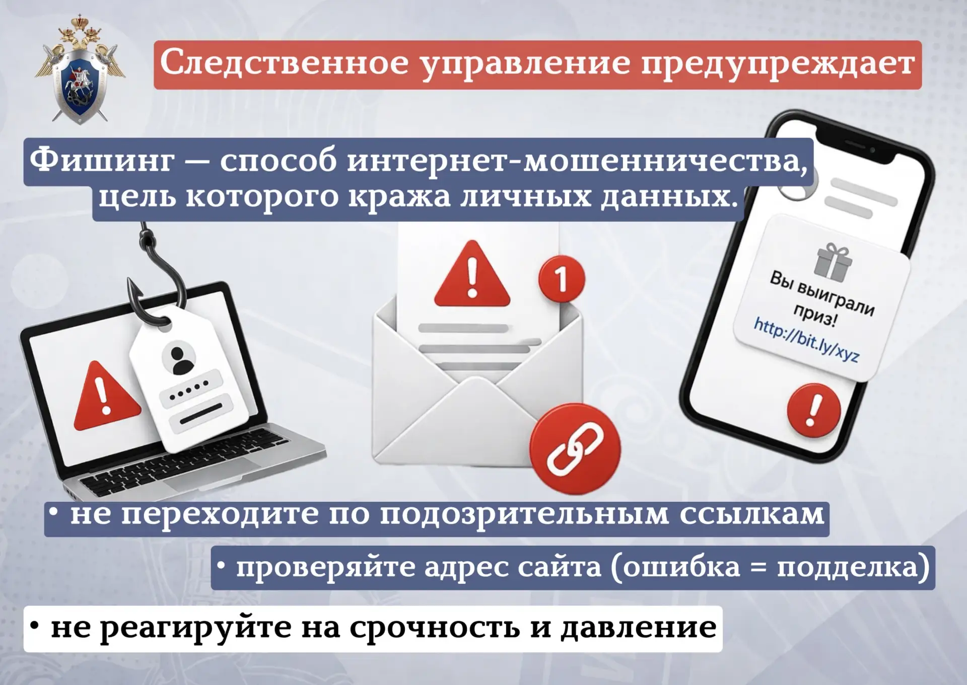 Следственное управление СК РФ по Ханты-Мансийскому автономному округу — Югре предупреждает граждан о рисках "фишинговых" атак, направленных на хищение персональных данных и денежных средств