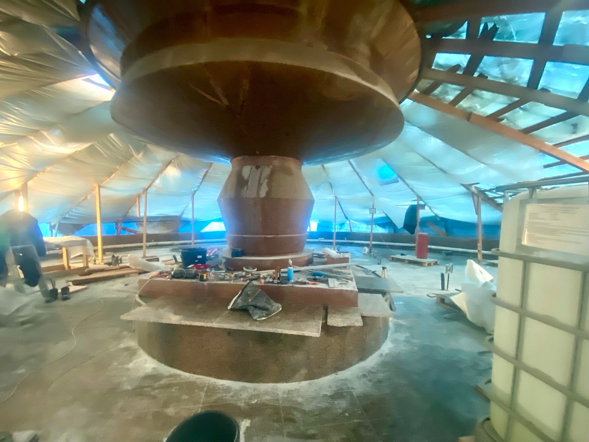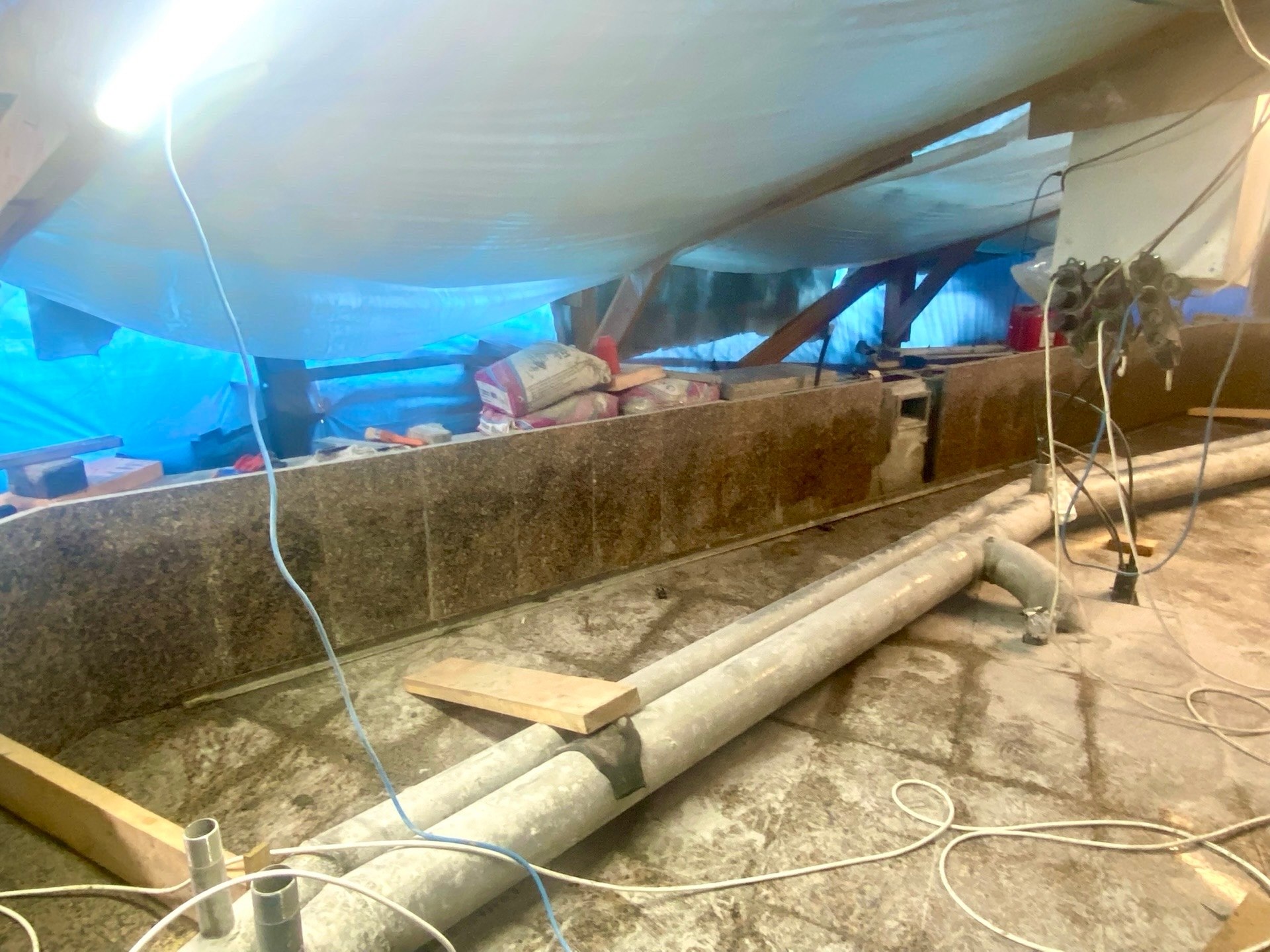 Сейчас на объекте работает 9 человек. Специалисты подрядной организации завершили монтаж 9 коллекторов, гранитной плитки основания и бортов чаши фонтана, прокладку трубы под кабельные линии, замену напорных полиэтиленовых труб, установку задвижек, дренажного оборудования и системы фильтрации.
