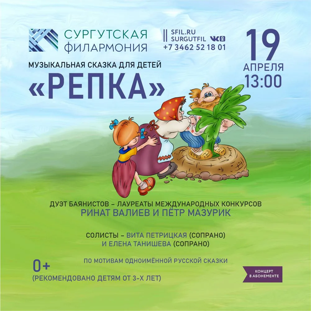 19 апреля в 13:00 - Музыкальная сказка для детей «Репка». Программа представляет собой занимательную версию русской народной сказки «Репка», рассказанную в сопровождении дуэта баянистов - Рината Валиева и Петра Мазурика.