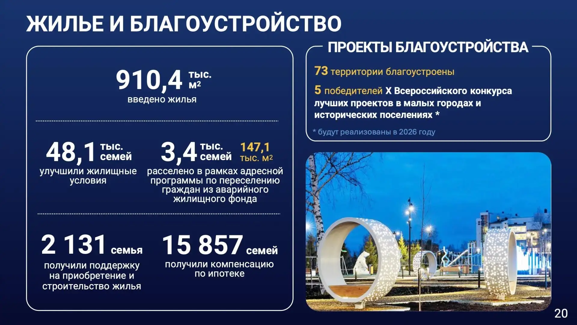 В 2025 году обустроено 73 общественные территории общей площадью 70 гектаров. Сразу пять региональных проектов одержали победу во Всероссийском конкурсе лучших проектов создания комфортной городской среды Минстроя России. Их реализация запланирована на 2026 год в Нефтеюганске, Когалыме, Лангепасе, Белоярском и Покачах.