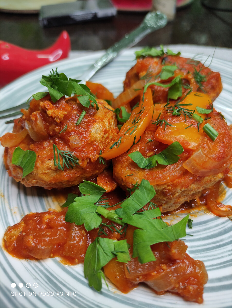 Тушение: Когда соус начнет закипать, добавьте в него нарезанные лук и перец. Закройте крышкой и тушите до мягкости овощей.