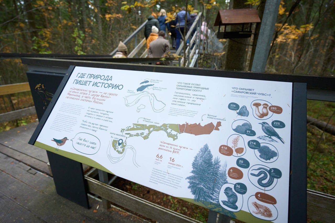 Главная экологическая жемчужина нашего города, доступная для туристов и жителей – Природный парк «Самаровский чугас». Его площадь составляет 3 000 гектаров, и окружная столица фактически «встроена» в заповедный таежный массив. Настоящая гордость парка – кедровые леса, занимающие почти половину всей его растительности. Далеко не каждый город России располагает такими богатствами, и наша задача – сделать знакомство с этой жемчужиной комфортным и безопасным.