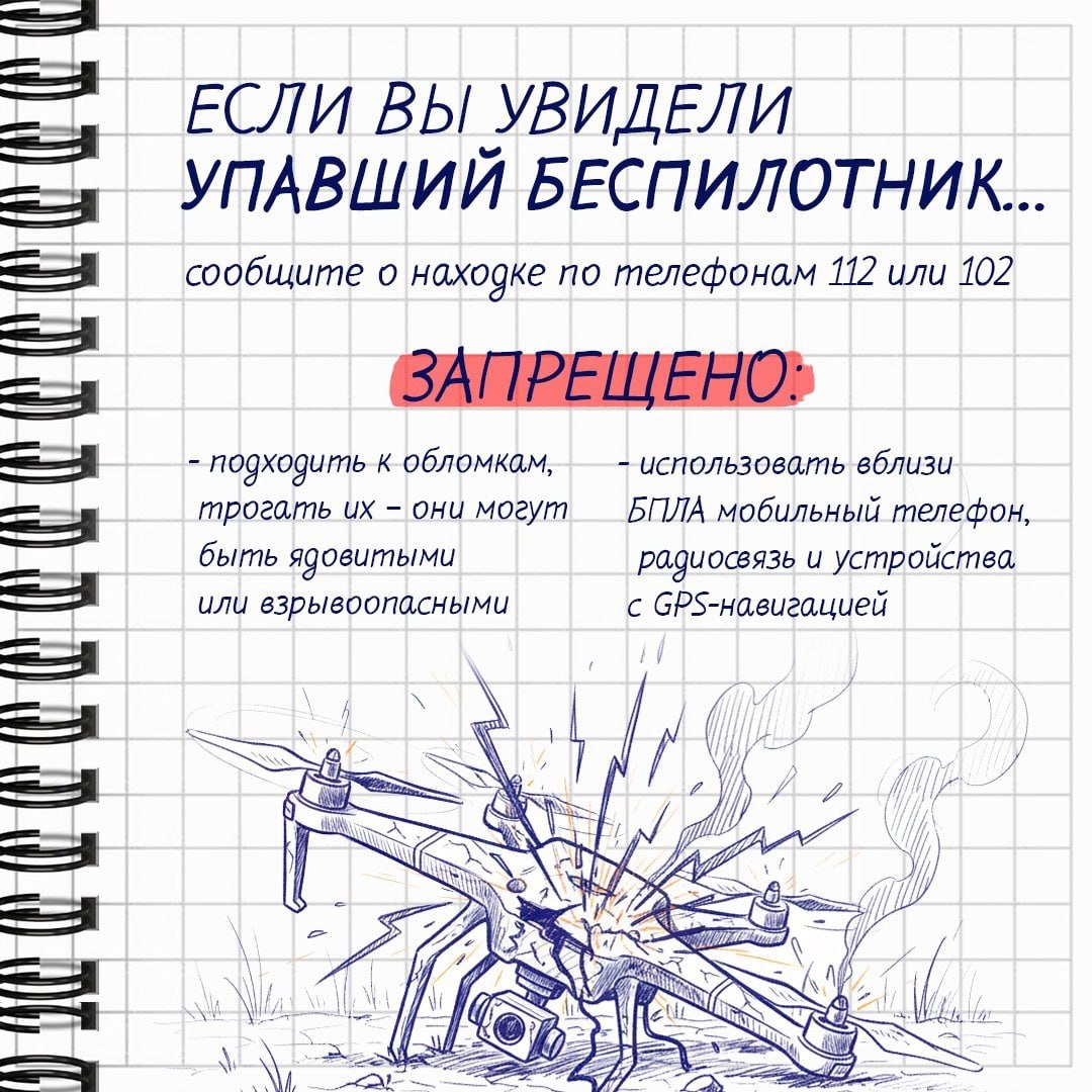 Категорически запрещено подходить к обломкам БВС и поднимать их, поскольку они могут быть ядовитыми или взрывоопасными. При этом особое внимание нужно уделять детям – следить, чтобы они не трогали никаких предметов.