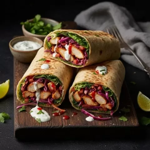 3. Подача шаурмы: На разложенный лаваш намазать соус, затем выложить овощи и мясо. Завернуть шаурму, начиная с нижнего края, загибая боковые части. Для хрустящей корочки рекомендуется обжарить её на гриле или в тостере.