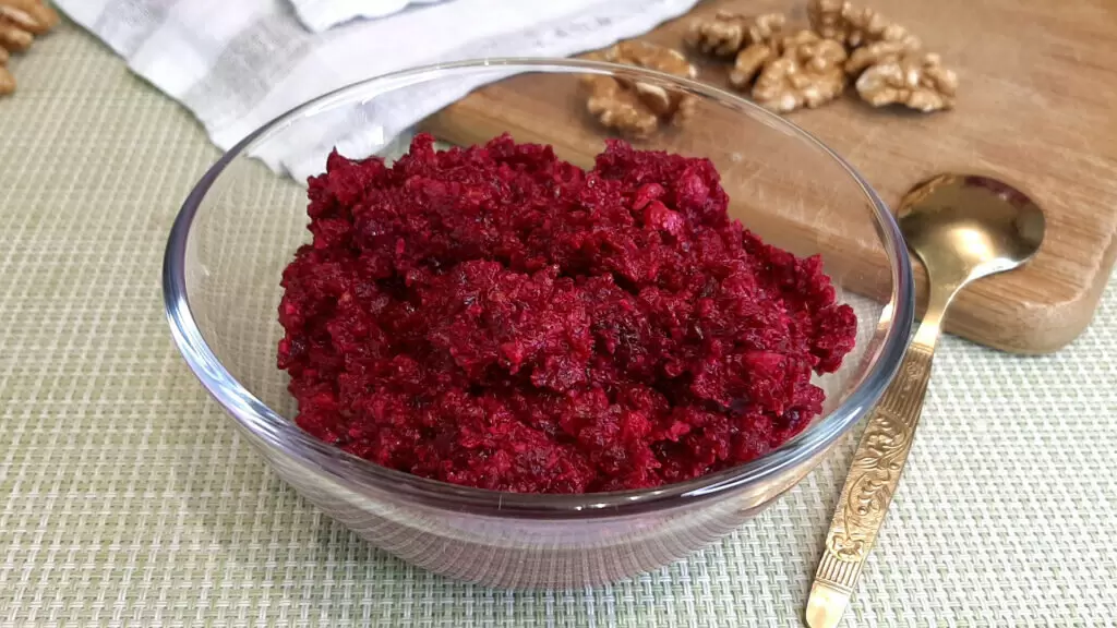 Уже нарезанную свеклу пересыпают в блендер вместе с грецкими орехами и чесноком (при желании). Если блендер отсутствует, свеклу можно натереть на терке, а орехи мелко порубить. Чтобы орехи стали более ароматными, их можно предварительно обдать кипятком и подрумянить на сухой сковороде.