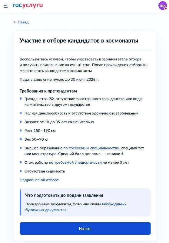 Полететь в космос может человек с такими параметрами: возраст до 35 лет, вес от 50 до 90 кг, гражданство России, высшее образование и стаж по специальности не меньше трех лет.