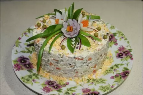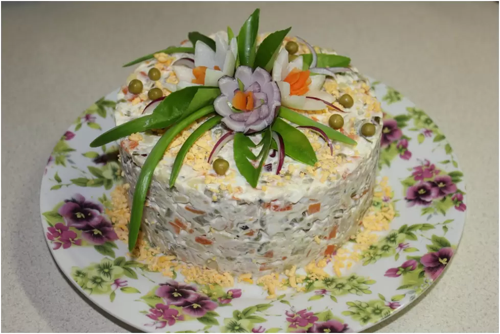 После формирования салата его лучше оставить в холодильнике на 2-3 часа, чтобы он держал форму. Для украшения подойдут любые овощи, зелень и даже яичный желток. Каждый может проявить креативность в оформлении.