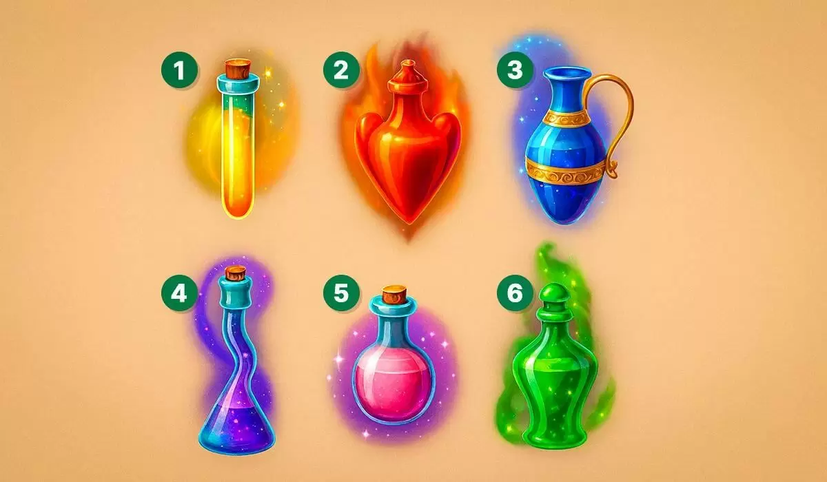 Чтобы пройти тест, взгляните на флаконы с волшебными зельями и выберите тот, который наиболее привлекателен. Каждый из вариантов сулит свой собственный сценарий любви, открывая тайны ваших будущих отношений.
