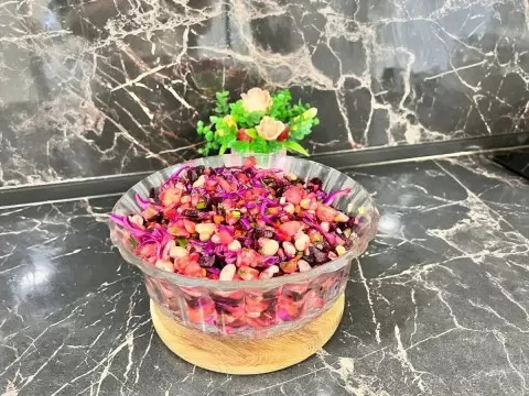 Нежный винегрет с краснокочанной капустой станет изюминкой вашего стола, радуя глаз яркими цветами и балансом вкусов. Приятного аппетита!