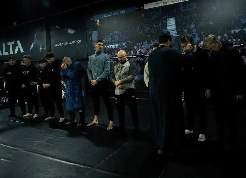 На фото священник благословляет Конора и его партнёров по тренировкам. На других кадрах он сидит рядом с Казанской иконой Божией Матери и молится.
