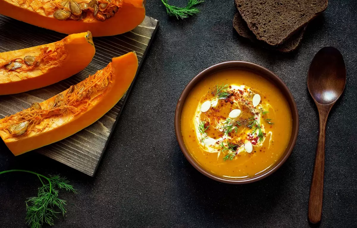 Приготовление: Тыкву, морковь и лук нарезать кубиками и обжарить на сливочном масле. Затем залить водой или бульоном и варить до мягкости. Измельчить все с помощью блендера, добавить сливки, приправить солью и перцем. Этот нежный суп подарит вам уют в прохладный вечер.