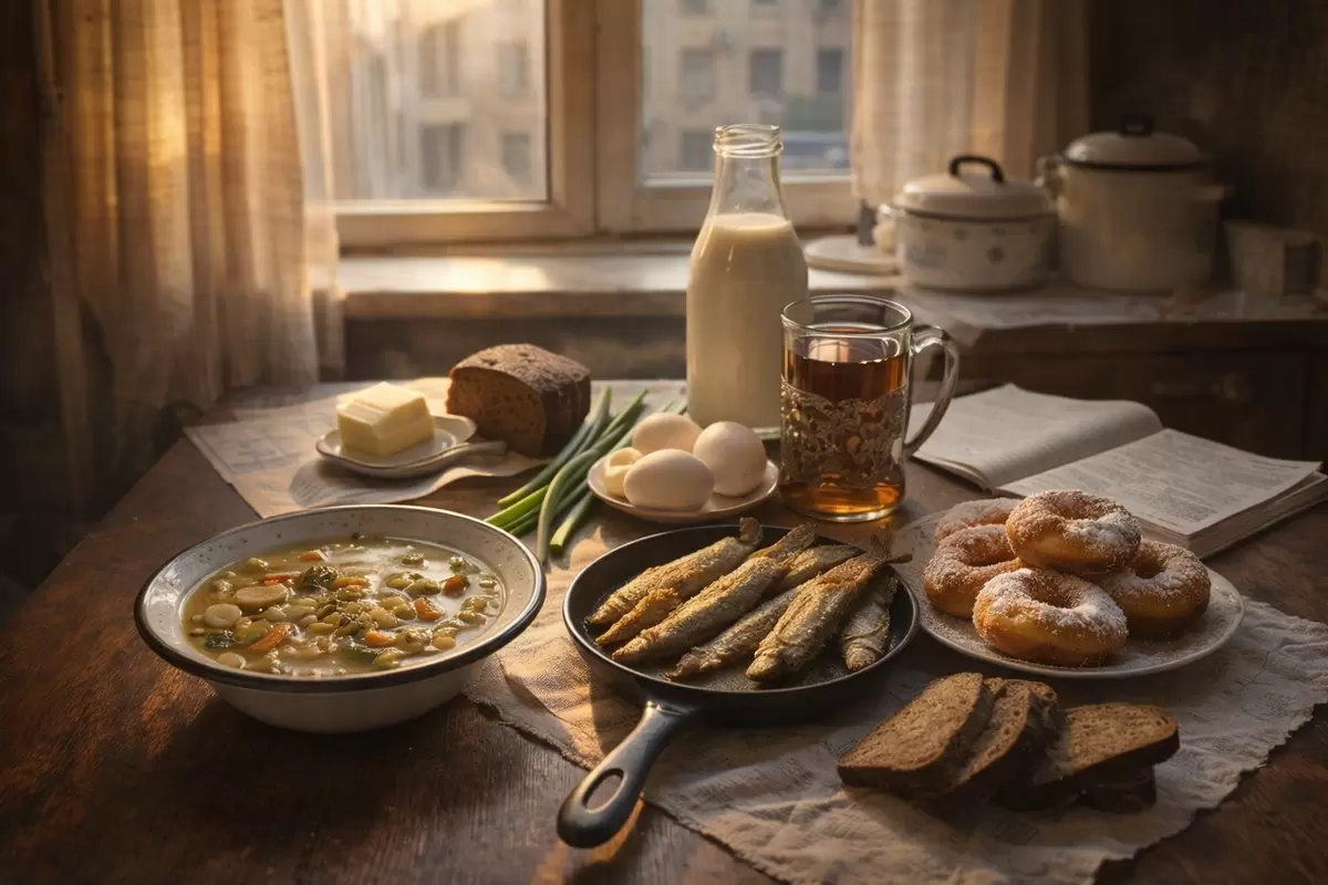 Ностальгические воспоминания о советском Ленинграде чаще всего начинаются именно с кухонных ароматов. Это запахи, которые струились из коммунальных квартир: свежий хлеб с маслом, поджаренный лук, вареная картошка с рыбой. На столах не было изобилия, но чувствовалось главное — тепло и уют.