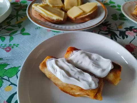 Утро начинается с легкой и вкусной ноты. На завтрак предложены аппетитные блинчики, фаршированные курицей и обжаренным луком. Остатки с предыдущего вечера отлично вписываются в это угощение — идеальный способ использовать приготовленные ранее продукты.