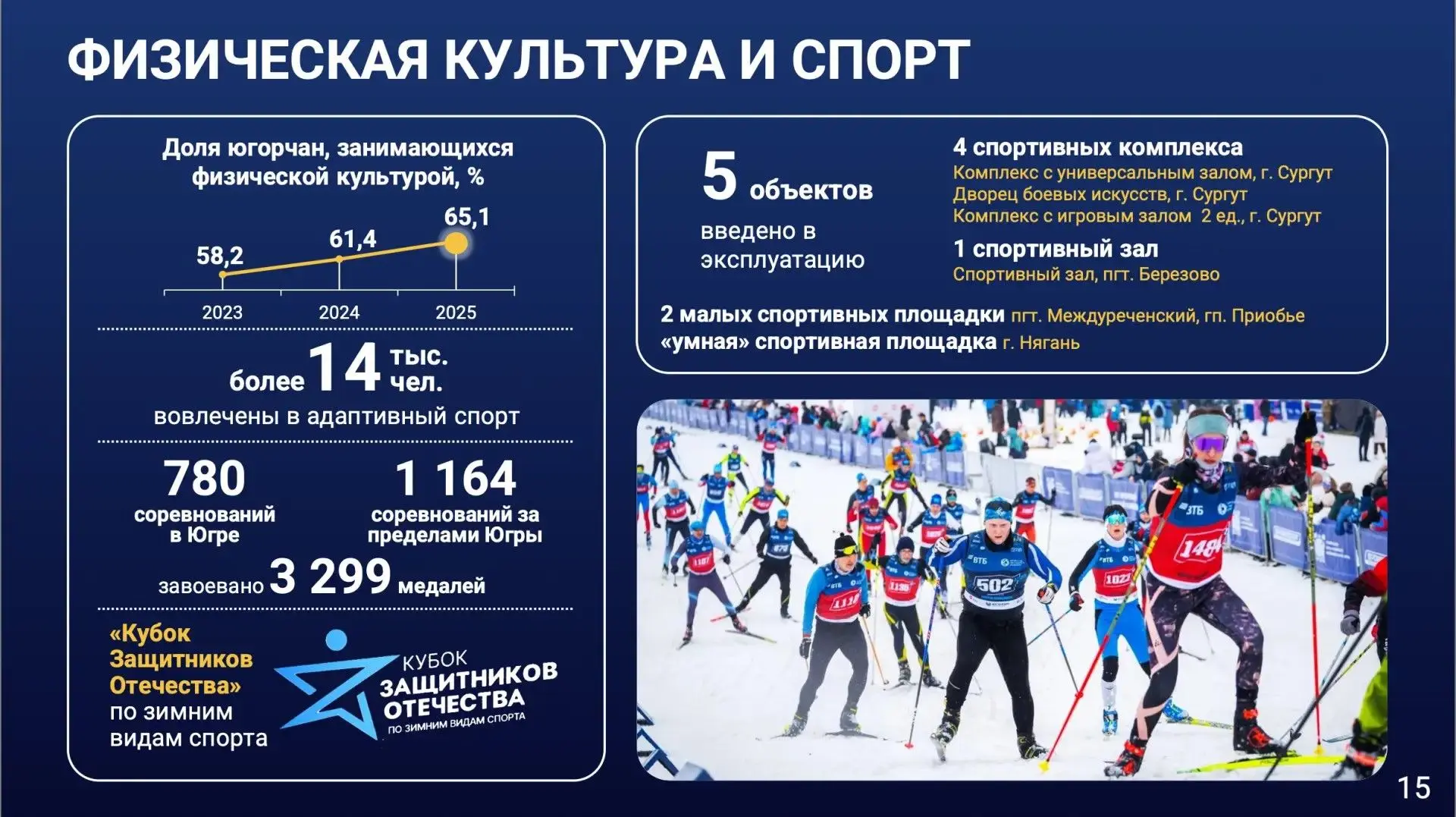 Сегодня более 65% югорчан регулярно занимаются физической культурой. По итогам 2025 года Югра вошла в пятерку регионов-лидеров по уровню удовлетворенности граждан условиями для занятий спортом, поднявшись с 13-го на 4-е место в рейтинге. Этот результат служит целевым критерием в Стратегии развития физической культуры и спорта в Российской Федерации на период до 2030года.