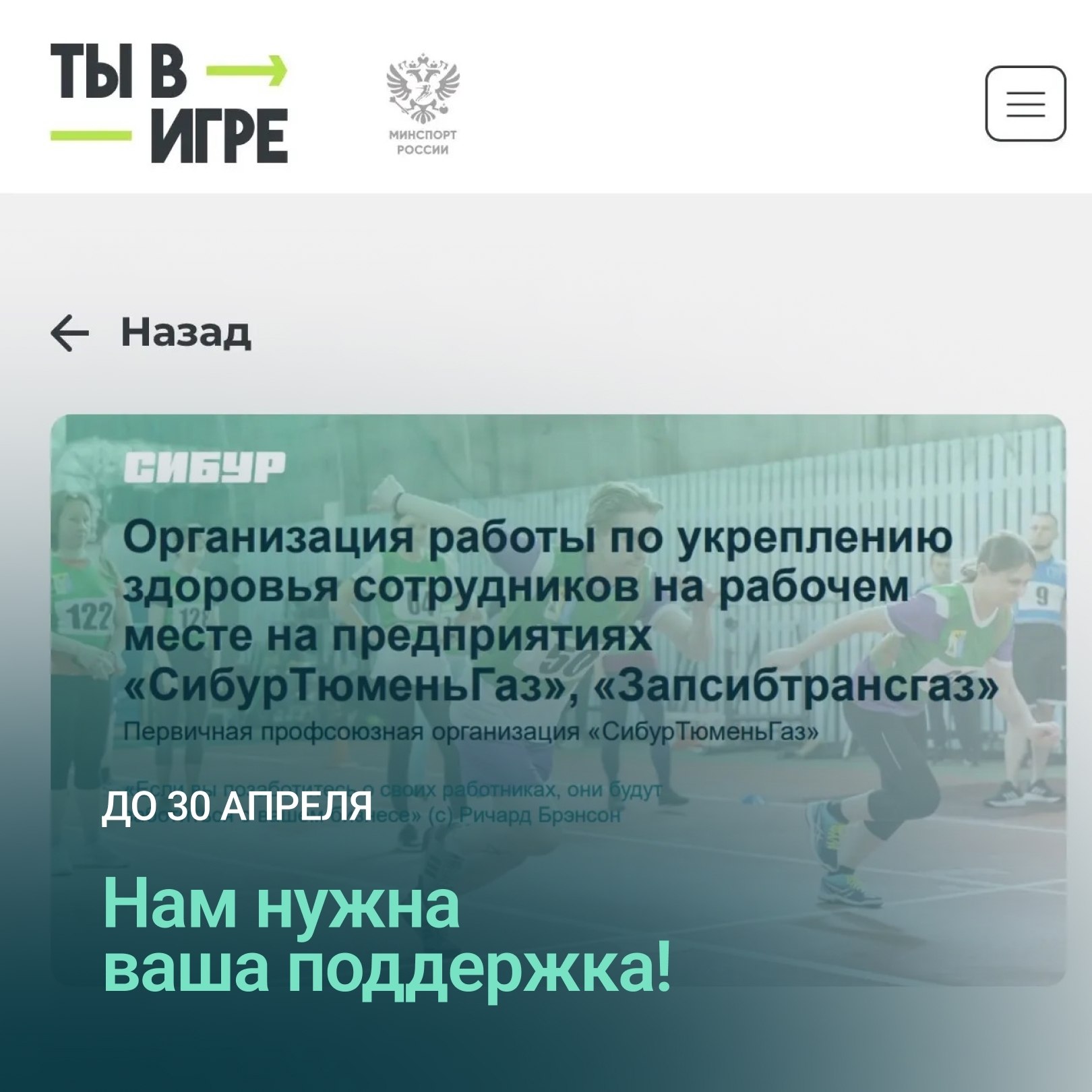 Первичная профсоюзная организация «СибурТюменьГаз» прошла в полуфинал (Топ-250 из 6000) и вошла в Топ-10 Всероссийского конкурса «Ты в игре» в номинации «Корпоративный спорт» с проектом «Минутка здоровья»