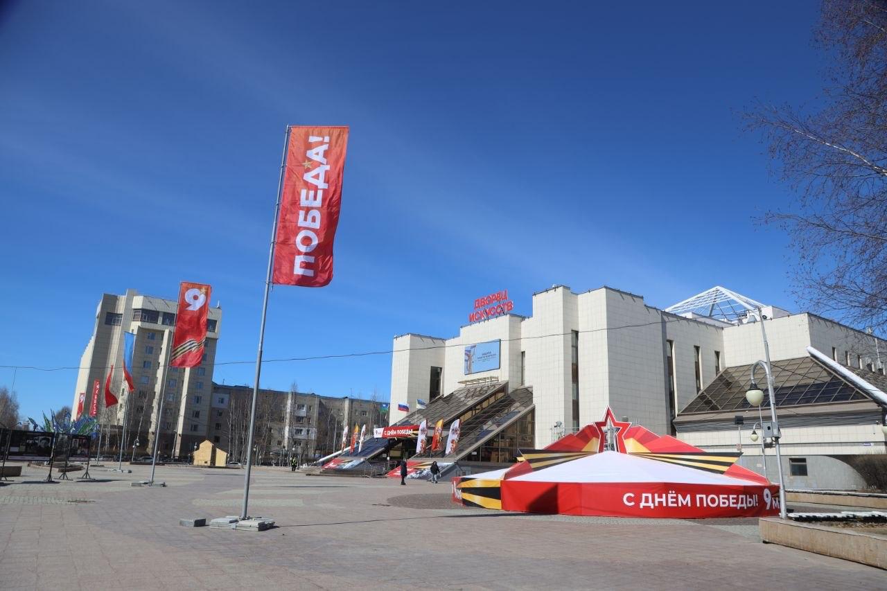 Там устанавливают праздничные арт-объекты, флаговые конструкции и баннеры и приводят в порядок тротуары, газоны и общественные пространства.